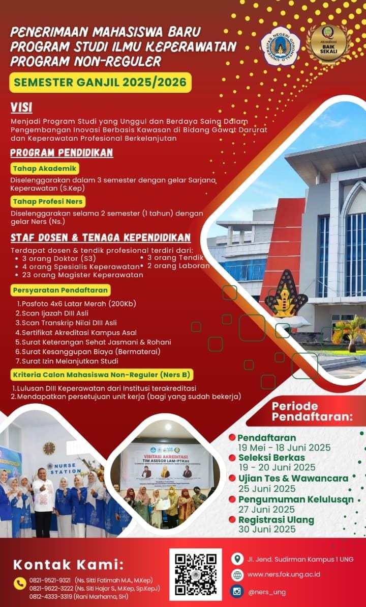 Fakultas Ilmu Kesehatan Universitas Negeri Gorontalo (UNG) resmi membuka penerimaan mahasiswa baru untuk Program Studi Ilmu Keperawatan Non-Reguler (Ners B) Semester Ganjil Tahun Akademik 2025/2026. Program ini ditujukan bagi lulusan DIII Keperawatan yang ingin melanjutkan pendidikan ke jenjang Sarjana Keperawatan (S.Kep) dan Profesi Ners.
