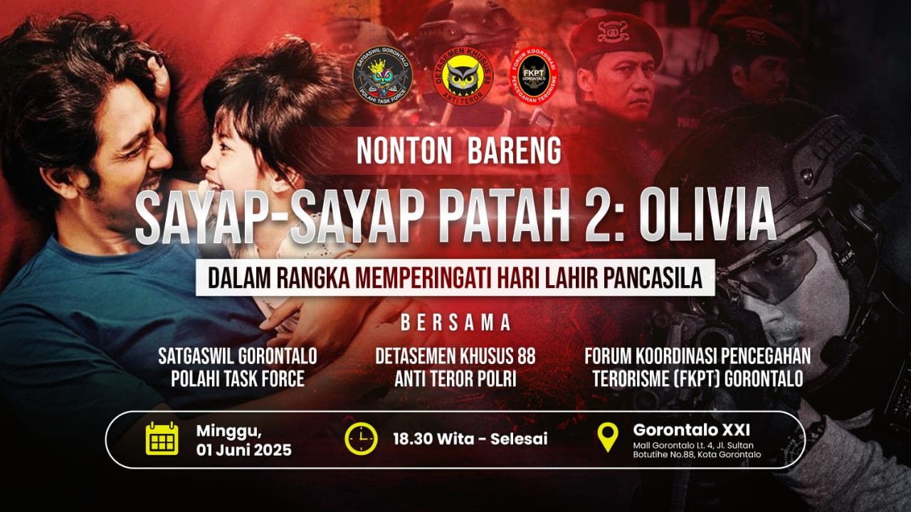 POROSRAKYAT.ID – Dalam rangka memperingati Hari Lahir Pancasila yang jatuh pada 1 Juni, Densus 88 Anti Teror Polri Satgaswil Gorontalo dan Forum Koordinasi Pencegahan Terorisme (FKPT) Provinsi Gorontalo akan menggelar kegiatan nonton bareng film Sayap-Sayap Patah 2: Olivia pada Minggu, 1 Juni 2025, bertempat di XXI Gorontalo pada pukul 18.45 WITA.
