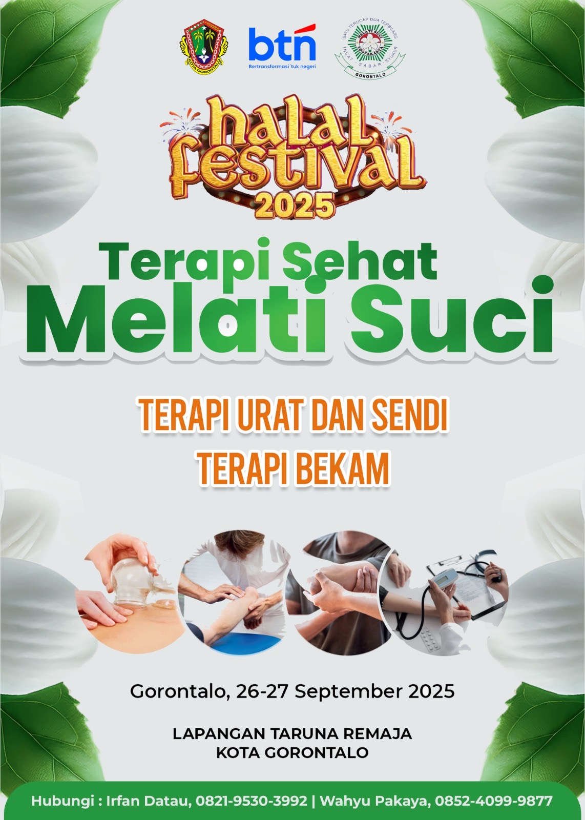 POROSRAKYAT.ID – Halal Festival 2025 yang digelar di Lapangan Taruna Remaja, Kota Gorontalo, menghadirkan berbagai kegiatan menarik. Salah satunya adalah “Terapi Sehat Melati Suci” yang berlangsung pada 26–27 September 2025 dan terbuka untuk seluruh masyarakat.