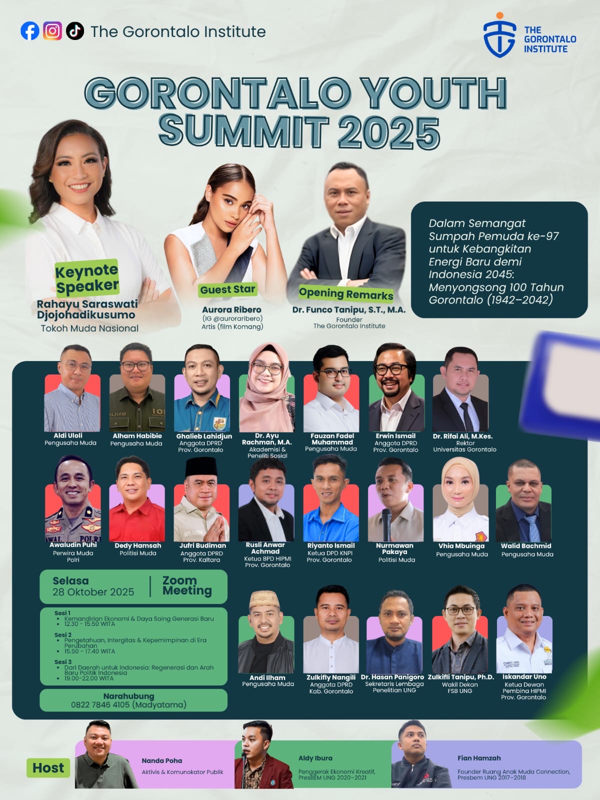 POROSRAKYAT.ID — Dalam semangat memperingati Sumpah Pemuda ke-97, The Gorontalo Institute sukses menyelenggarakan Gorontalo Youth Summit 2025, Selasa (28/10), secara daring melalui platform Zoom Meeting. Kegiatan bertema “Menyalakan Semangat Sumpah Pemuda Menuju 100 Tahun Gorontalo (1942–2042)” ini menjadi forum reflektif sekaligus ruang strategis bagi generasi muda untuk merancang arah masa depan Gorontalo menuju abad keduanya.